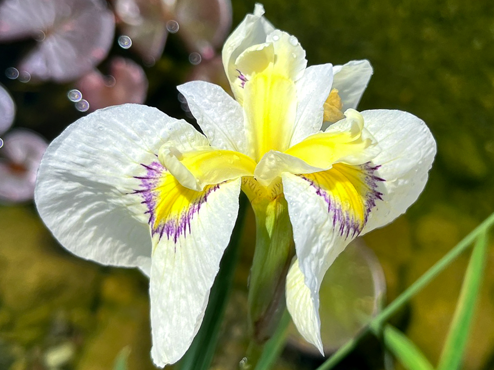 ‘Cascadian Snow’ is a stunning hybrid iris. Petals are white and yellow, with dark purple accents.