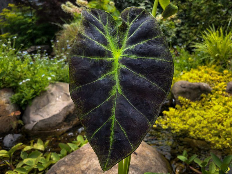 Big elephant-ear leaves are a smokey purple with lime green highlights.
